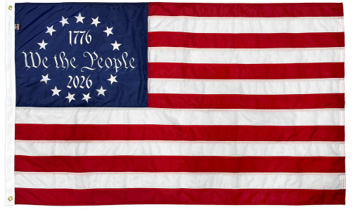 Celebrate the 250th Anniversary of American Independence on July 4th, 2026 with our We the People Betsy Ross Flag! Digitally Printed stars and we the people. Stripes are sewn. Fly hems are finished with 4 rows of lock stitching, back tacked and reinforced with 102-stitch X-boxes to resist fraying. The bold red, white and blue inspires a sense of pride and honor. Flags are completed by hemming with T60 thread, the strongest in the industry that can withstand 60 pounds of force. Our flags are FMAA certified 100% Made in USA from 100% U.S. sourced materials and labor.